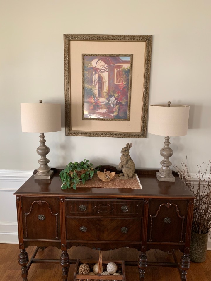 This buffet rests on the longest wall in my house, near the front door. If I told you when we first walked into our house before we purchased it, I told Terry, ”Its a perfect spot for the buffet!” would you believe me? It’s true I did.
